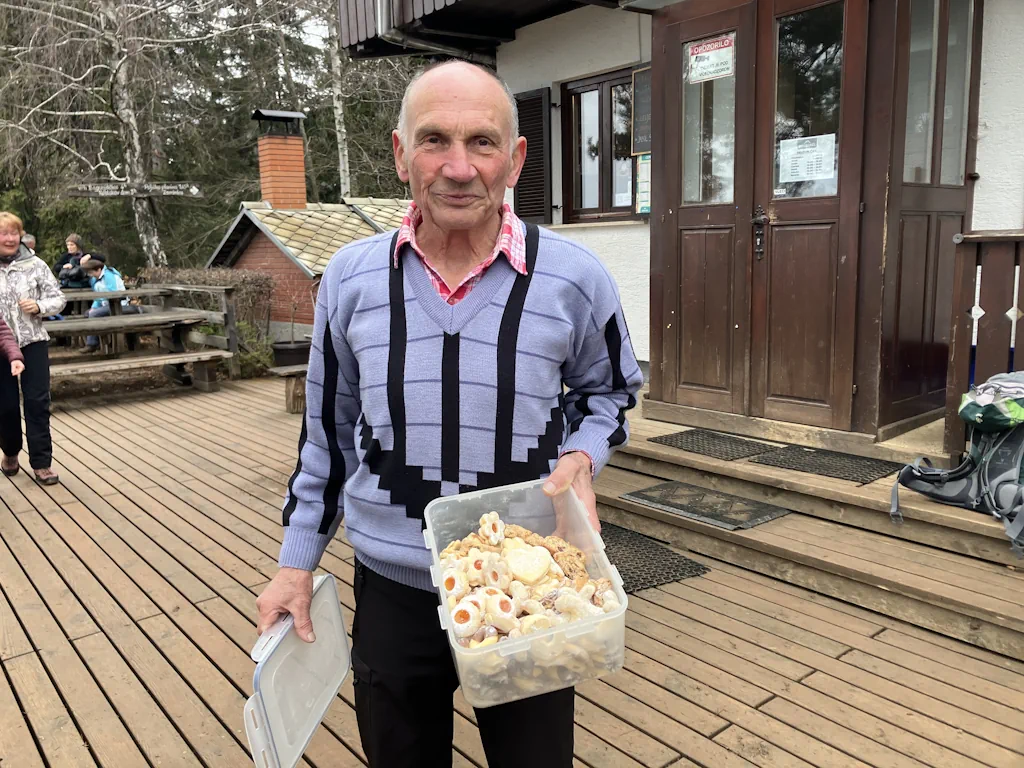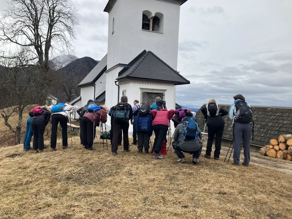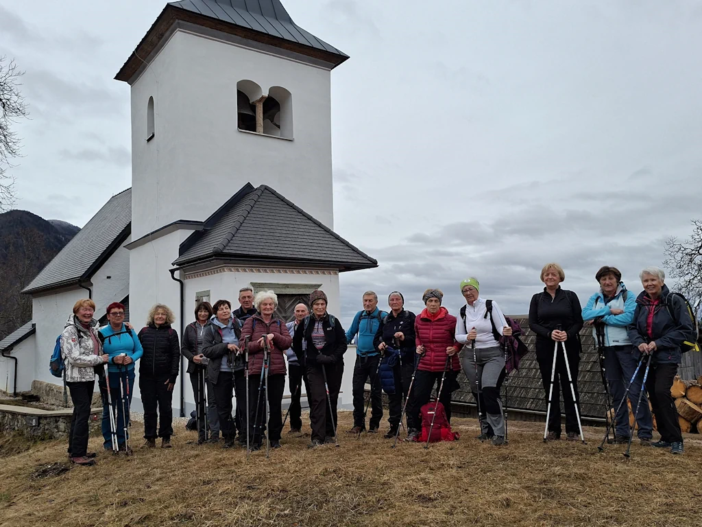 Pri cerkvici smo se iz vseh strani poslikali, saj kdor je lep je tudi z zadnje strani lep, potem pa se pri Sankaški koči posladkali in nazdravili slavljencu Tinu. Vračali smo se po cesti, druženje pa zaključili v Ajdni, da smo še Andrejki zaželeli čim več tako veselih skupnih pohodov.