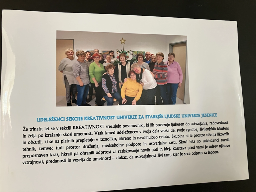 Udeleženci sekcije kreativnost univerze za starejše Ljudske univerze Jesenice so v naših prostorih pripravili razstavo likovnih del in najprej je naš podpredsednik Pavel po kratkem nagovoru otvoril razstavo. Ker se je po štirinajstih letih vodenja sekcije njihova mentorica Marjeta odločila, da je čas za slovo, so se ji učenci zahvalili in ji podarili, kot so sami rekli, nekaj za njeno dušo.